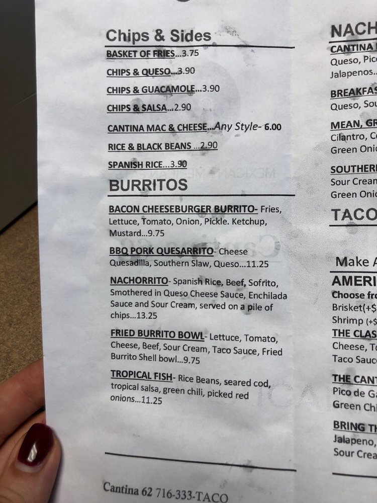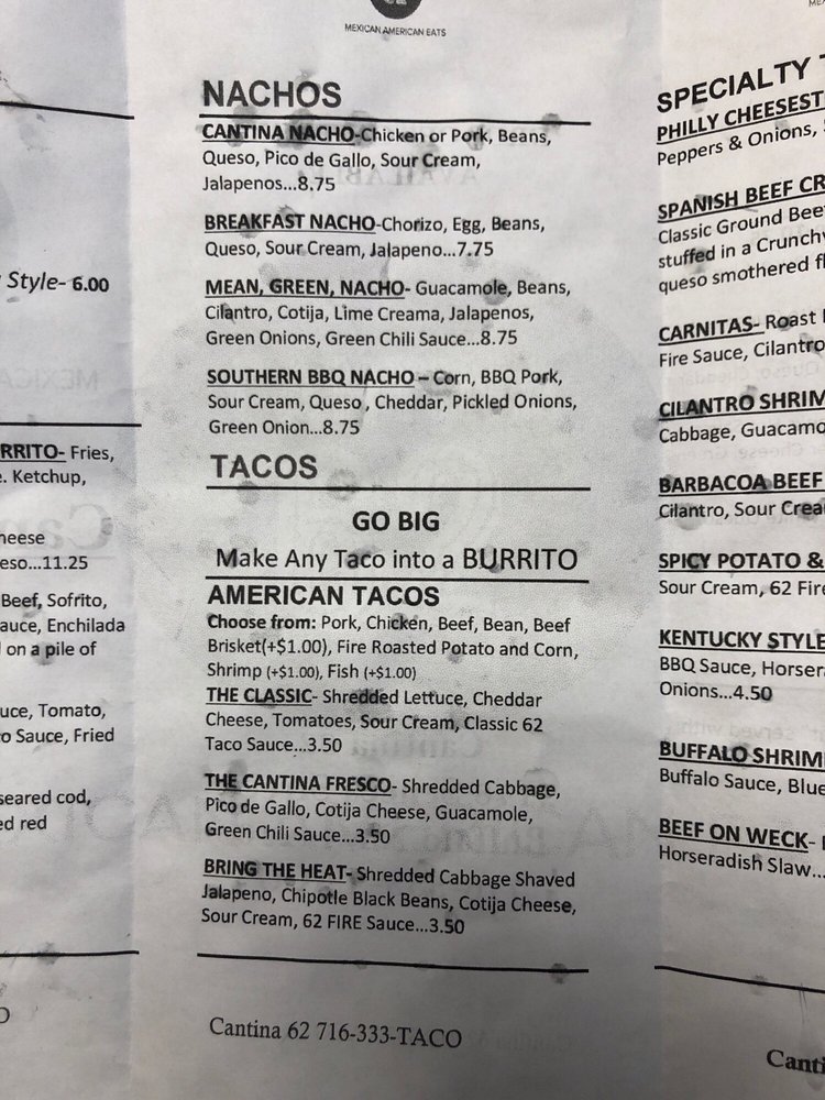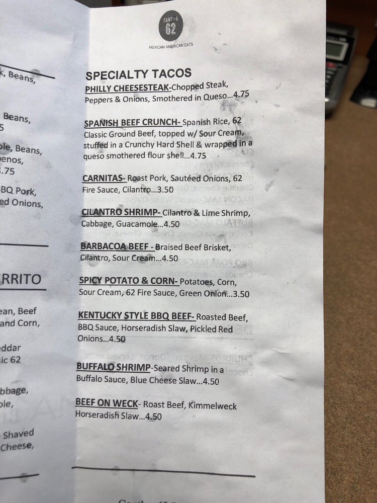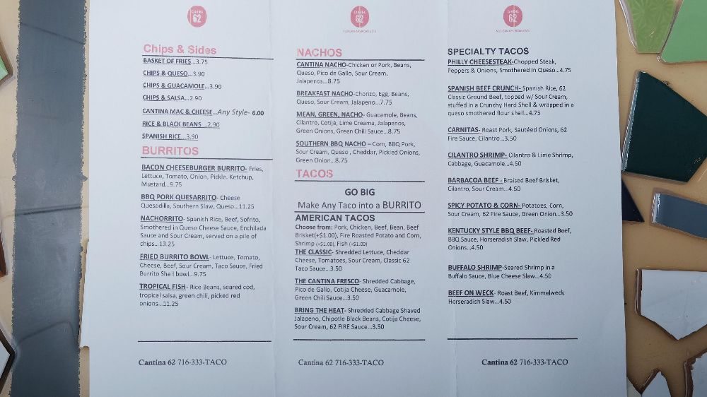 Introducing the menu at Cantina 62, nestled in Buffalo, NY, is a true taco lover's delight. This vibrant eatery offers a diverse array of options that appeal to various palates. Signature dishes like the Birria Tacos boast tender, slow-cooked beef, complemented by the perfect tortillas that soak up savory juices. For a twist, try the unique Philly Mac Burrito, blending classic flavors with a cheesy kick.